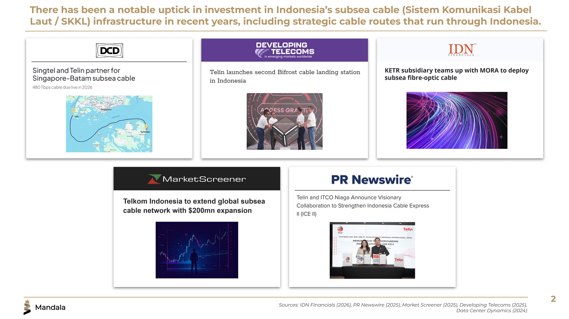 The purpose of this document is to provide general information about Subsea Cables 101: Indonesia in Focus. The contents of this document should not be construed as specific recommendations or advice. For questions about the contents of this document, please contact Mandala Consulting. The information in this article is accurate as of the publication date. However, due to the rapidly changing nature of the law in Indonesia, the accuracy of the information will be limited.